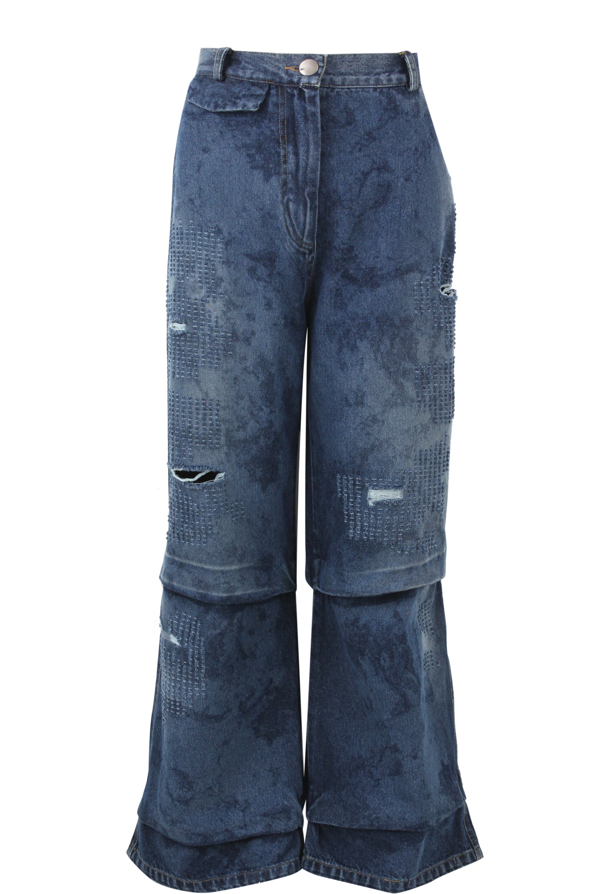 Unleash your daring side with our Stitched Pants! Crafted from durable denim, these pants feature a unique random wash and edgy ripped holes. Perfect for those who love to add a bold touch to any outfit.