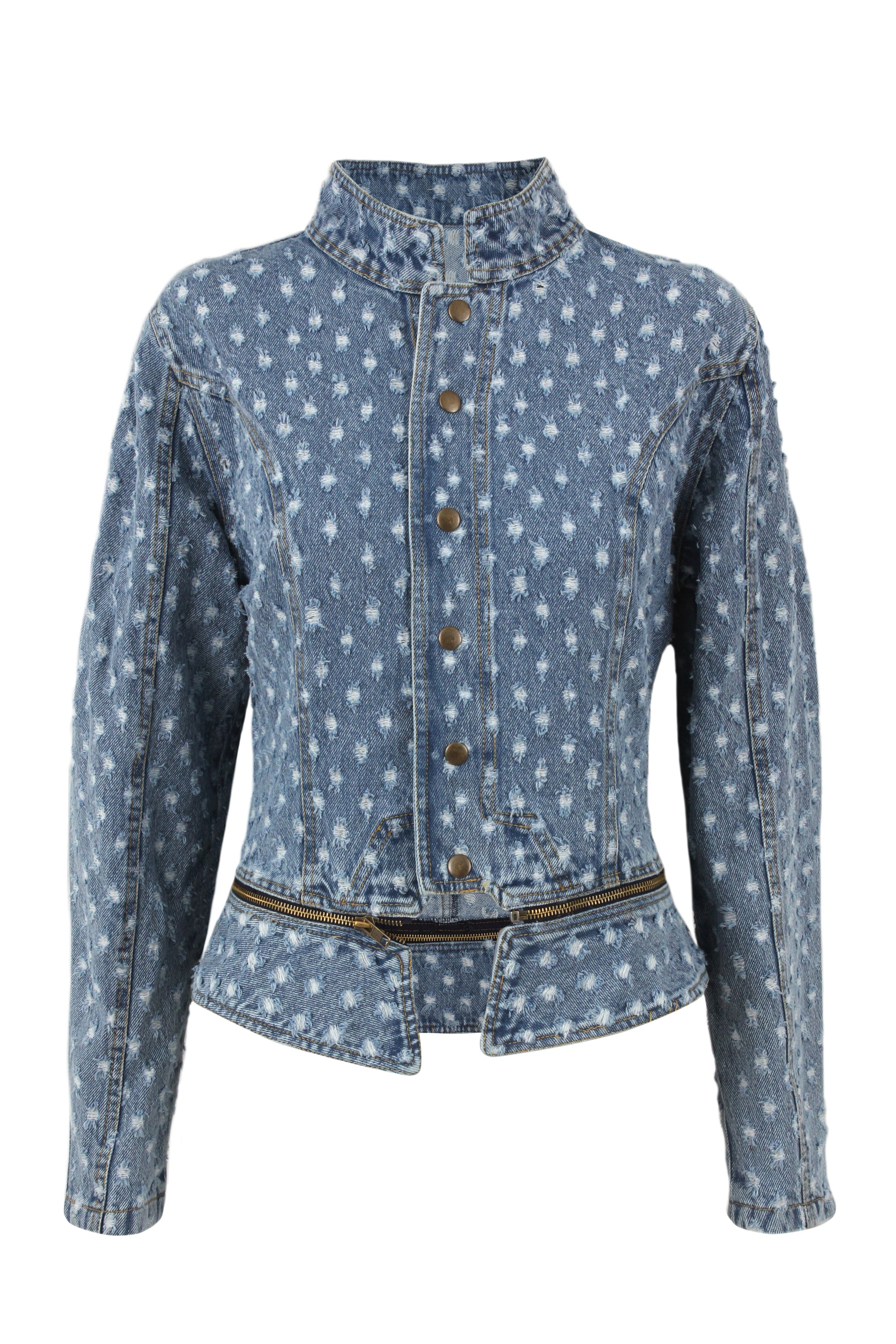Intensify your wardrobe with The Ripped Jacket! This light wash denim jacket features a unique ripped design and a removable zipper for added versatility. Its lightweight construction makes it a multi-seasonal piece that can be worn all year long.